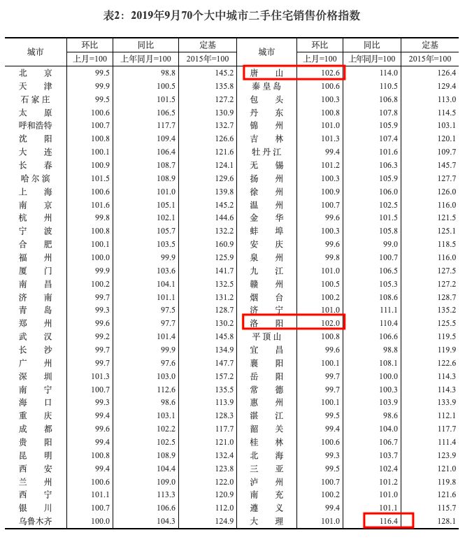 9月份,房价总体保持稳定,但二手房价格较为低迷。 据统计,9月新房价格环比上涨的有53城,比上月再减少2城,为连续4个月减少;二手房价格环比上涨的有40城,比上月再减少3城。 其中,新房价格环比涨幅在2%以上的有两城:南宁领涨,涨幅2.1%;洛阳次之,涨幅2%。二手房价格环比涨逾2%的也有两城:唐山以2.6%涨幅居首,洛阳涨幅同样为2%。
