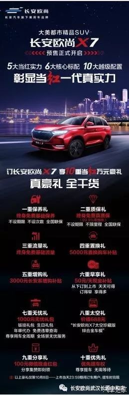 怎么样?在跟随小编详细的了解了长安欧尚X7的诸多产品亮点之后,您是否已经跃跃欲试要带上它来一场说走就走的旅行呢,别着急,目前呢这辆大美都市精品SUV正在预售环节,因为其本身就有着堪比30万级合资车型的超过性价比,加上厂家在预售中推出了诸如终身质保、终身基础保养等10重超值大礼包,所以预定非常火爆。感兴趣的小伙伴们赶紧行动吧,如此高的性价比,还有这么多的钜惠政策。等啥呢?再等冬天就要来喽!!
