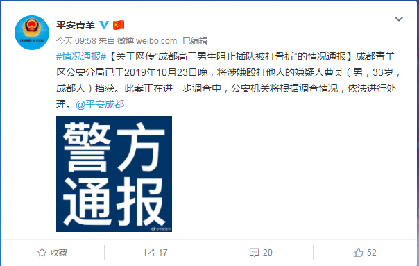 四川成都市公安局青羊区分局官方微博@平安青羊 10月24日上午发布“关于网传成都高三男生阻止插队被打骨折”的情况通报。