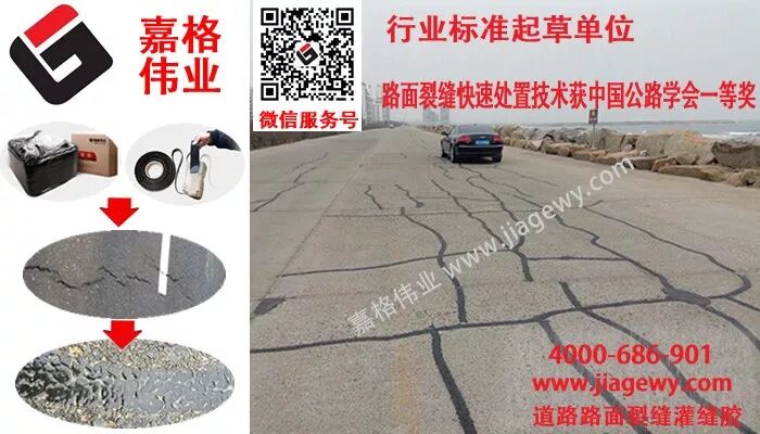 了解更多沥青灌缝胶/裂缝沥青灌缝胶订做?北京嘉格伟业专注路面材料研发生产销售十余年,完成路面材料供应项目2000余项,公司路面裂缝修补技术获中国公路学会2015年科学技术一等奖,公司研发的水泥(沥青)混凝土道路路面裂缝灌缝填充密封修补材料,沥青灌缝胶别名又叫:热熔型密封胶,道路密封胶,道路灌缝胶,沥青灌缝胶,裂缝沥青灌缝胶订做,路面灌缝胶等,可以用于公路,机场,高速,国道,省道,厂区道路等路面裂缝和伸缩缝的填充密封,所有产品厂家直销,欢迎进入图片上的网址或拨打图片上的400电话咨询。您也可以微信扫描图片上的二维码,关注嘉格伟业微信服务号,随时随地获取行业相关动态,路面养护相关方案、案例和路面养护材料信息。