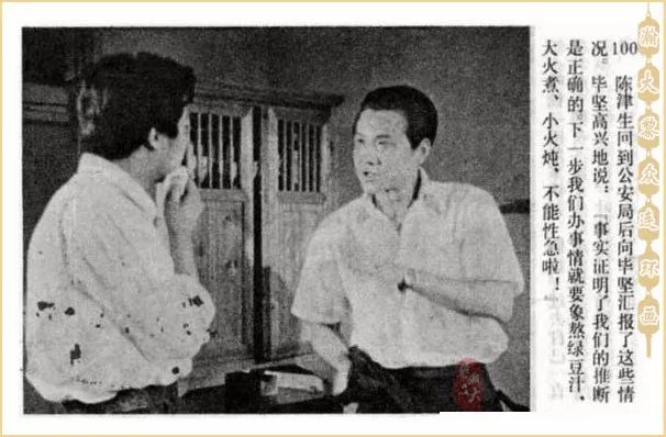100、陈津生回到公安局后向毕坚汇报了这些情况。毕坚高兴地说:“事实证明了我们的推断是正确的。下一步我们办事情就要象熬绿豆汁,大火煮,小火炖,不能性急啦!”