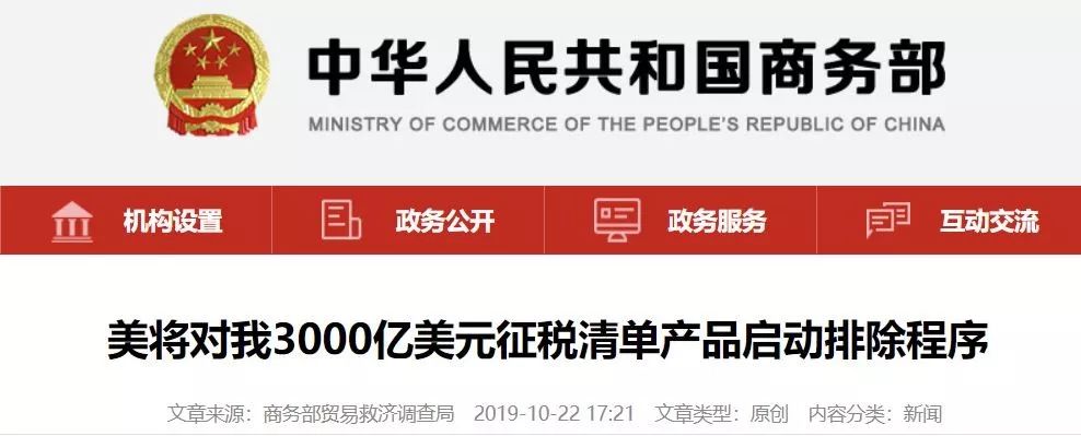 10月22日,国家商务部发布消息称,美将对我3000亿美元征税清单产品启动排除程序。