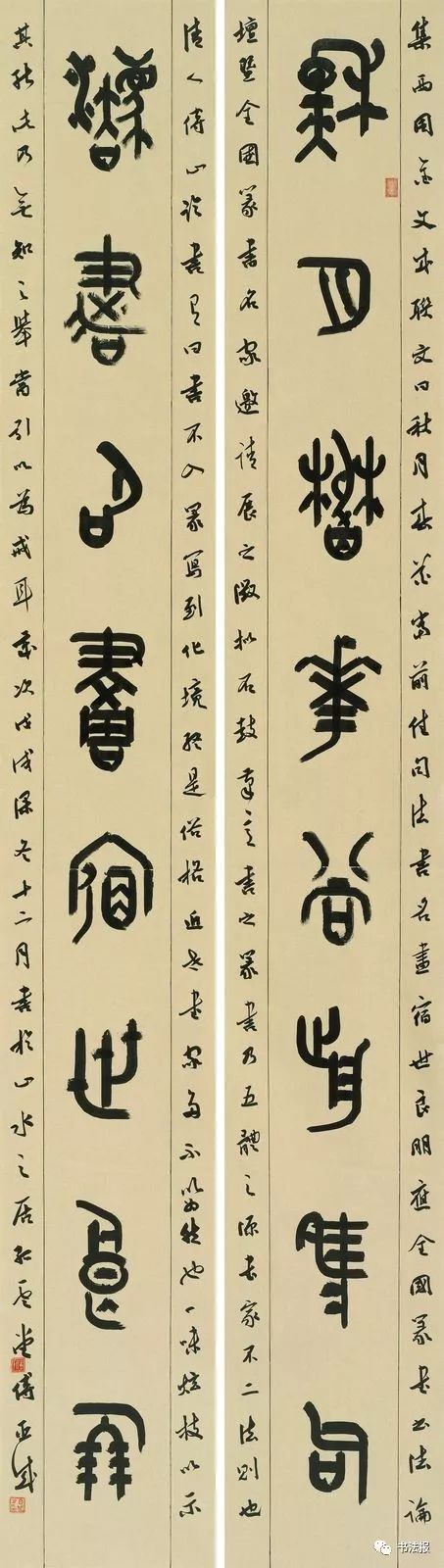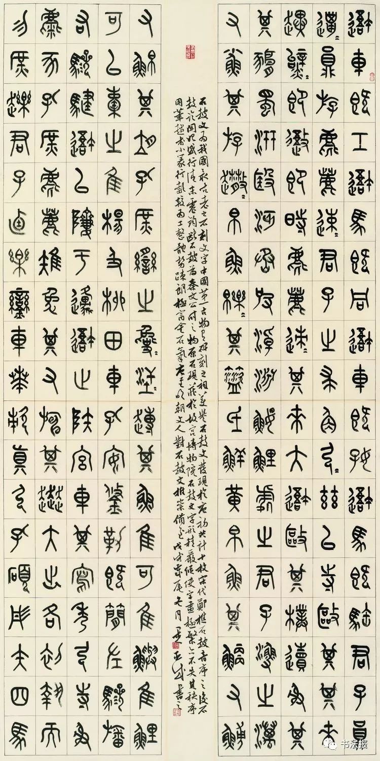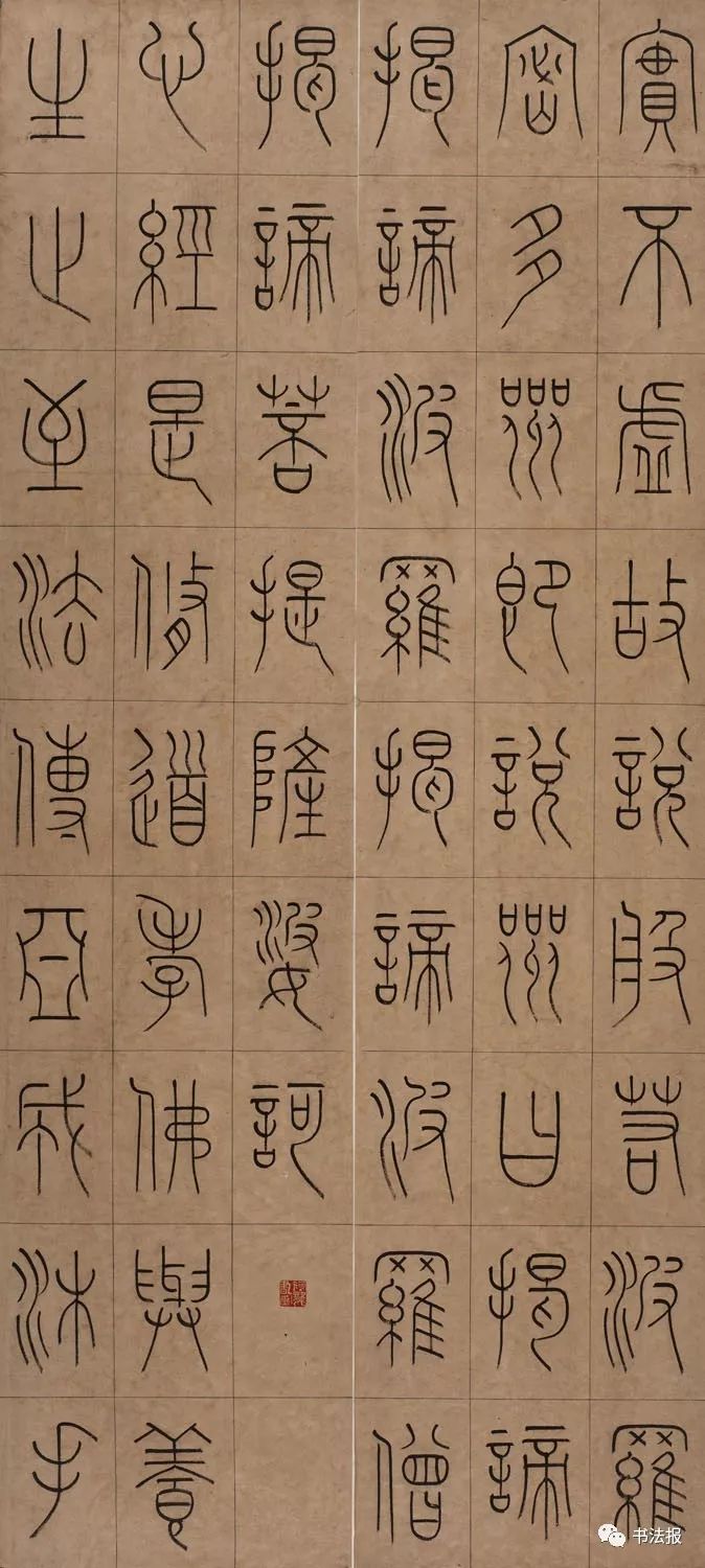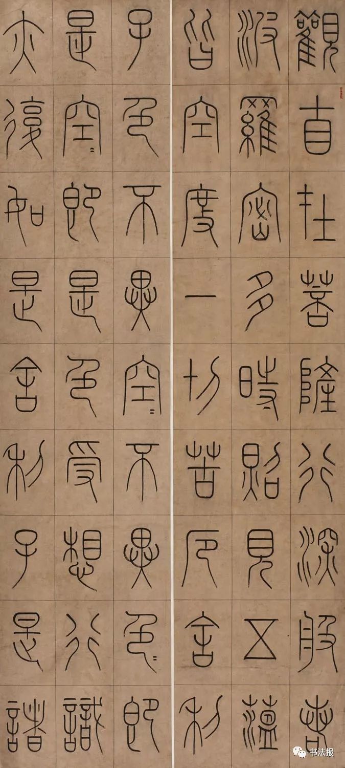 从《毛公鼎》、《散氏盘》、《白盘》到李斯、李阳冰、吴昌硕、邓石如、赵之谦、吴让之、徐三庚、杨沂孙、吴大澂,可谓取法丰富,形式更是繁杂多样。中堂、对联、扇面、三条屏、四条屏加之拼接、题笺、题跋、钤印,用纸更是五花八门。各类色宣、蜡染、粉笺、洒金、泥金一应俱全,呈现出空前的色彩冲击,点缀在各种展厅中。以上现象体现了篆书发展的积极一面,但同时也存在着一些问题,应引起有识之士的高度重视,以期矫正时弊,推动篆书领域良性健康发展,无愧于这个千载难逢时代。