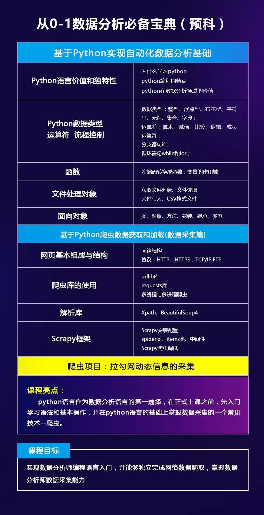 预科课程《Python基础+爬虫技术实践》,充分考虑到大部分学员0基础或基础薄弱的情况,这是针对不同基础的同学设计的基础强化和技术拓展的课程,这部分课程的学习不影响就业,但却是强有力的就业加分项,共30课时左右。