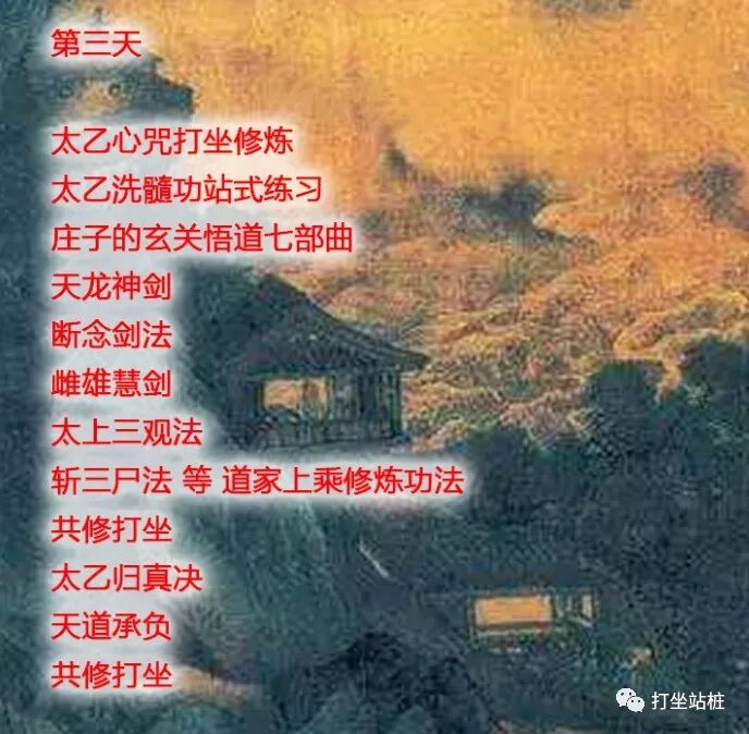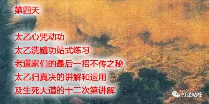 2.太乙洗髓功:本课程传授“太乙洗髓功”以上乘修心性功为纲要,性中有命;以生精、固精、养精、化精为手段,命中有性。以腾筋、开筋、揉筋、撑筋、长筋、伸筋、拔筋、荡筋、锻筋、摩筋、搓筋、展筋等为手段,复以太乙心咒化雌雄慧剑而斩三尸、灭六贼,外用可以金筋玉骨,内用可以固精无漏、启动胎息。