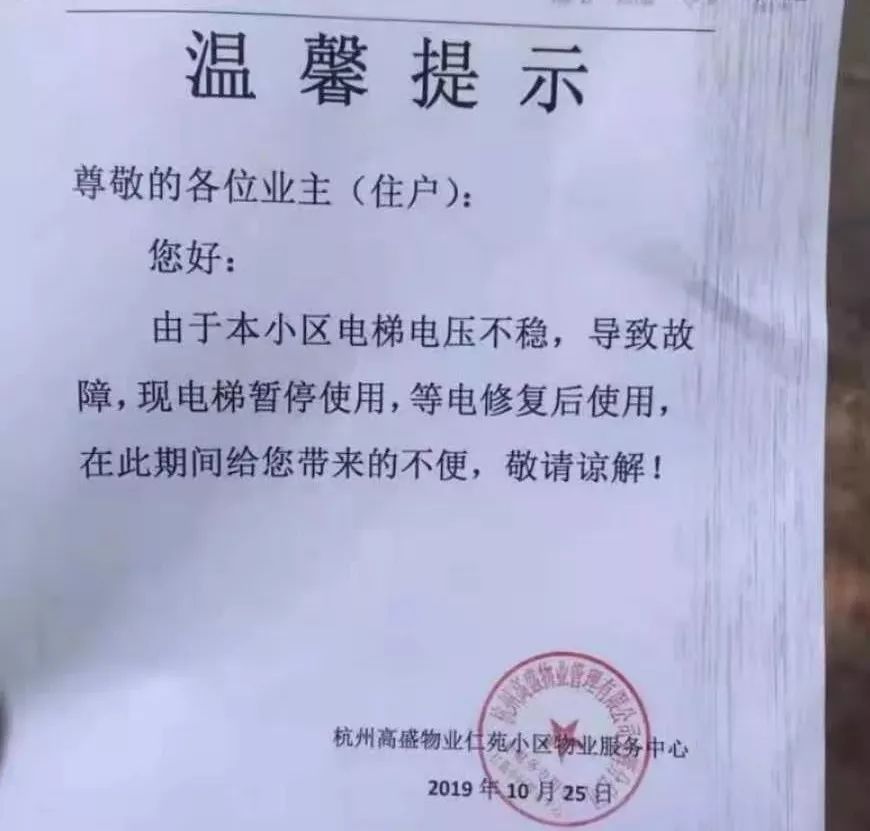 物业正在安排人去每栋楼张贴告示,意思是小区电压不稳,电梯暂停使用,请住户们耐心等待电梯恢复。