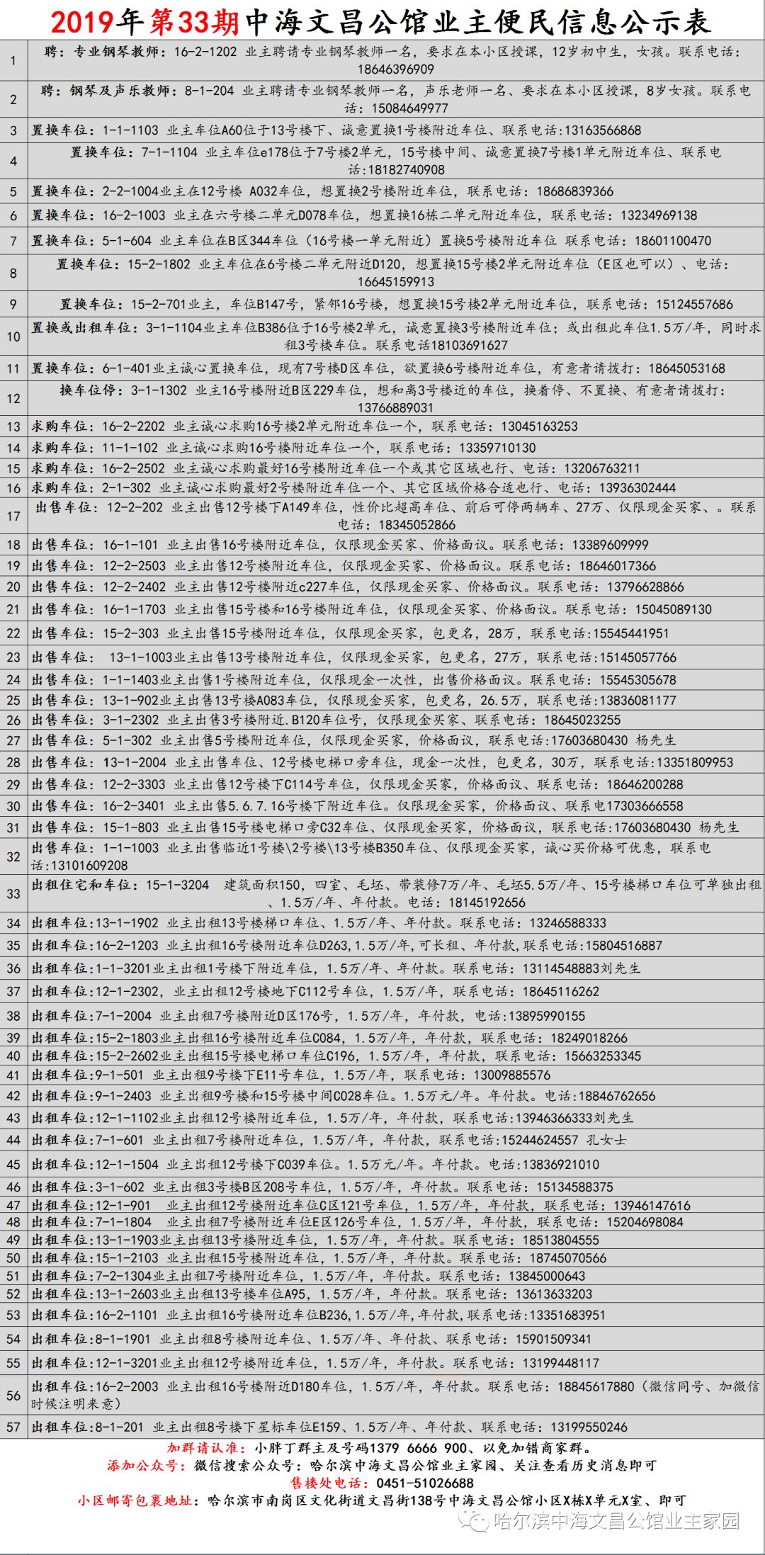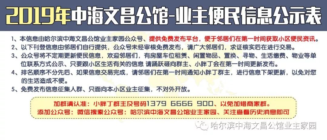 1、本信息由哈尔滨中海文昌公馆业主家园公众号、提供免费发布平台,便于邻居们在第一时间获取小区便民资讯。