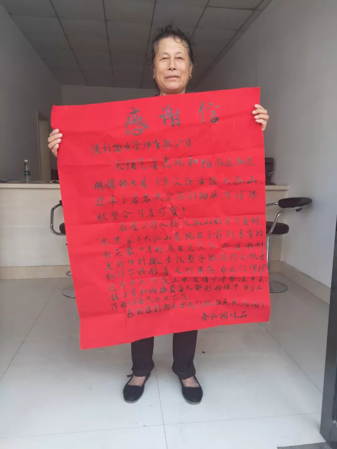 紧要关头她想起了自己的贴心管家孙楠,孙楠在得知此事之后,第一时间在各业主群中发出寻物通知,并且在园区中紧急寻找。幸运的是,背包被另一位业主捡到并联系到了孙楠,她在第一时间去找该业主道谢并取回了于女士的背包。背包重回于女士的手中,她非常感动并送来了锦旗表示感谢。