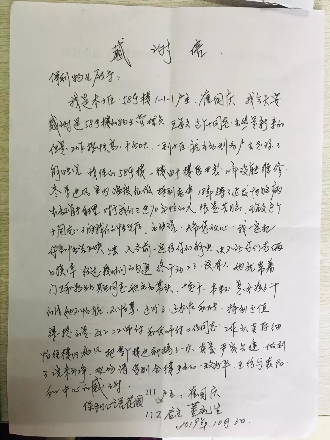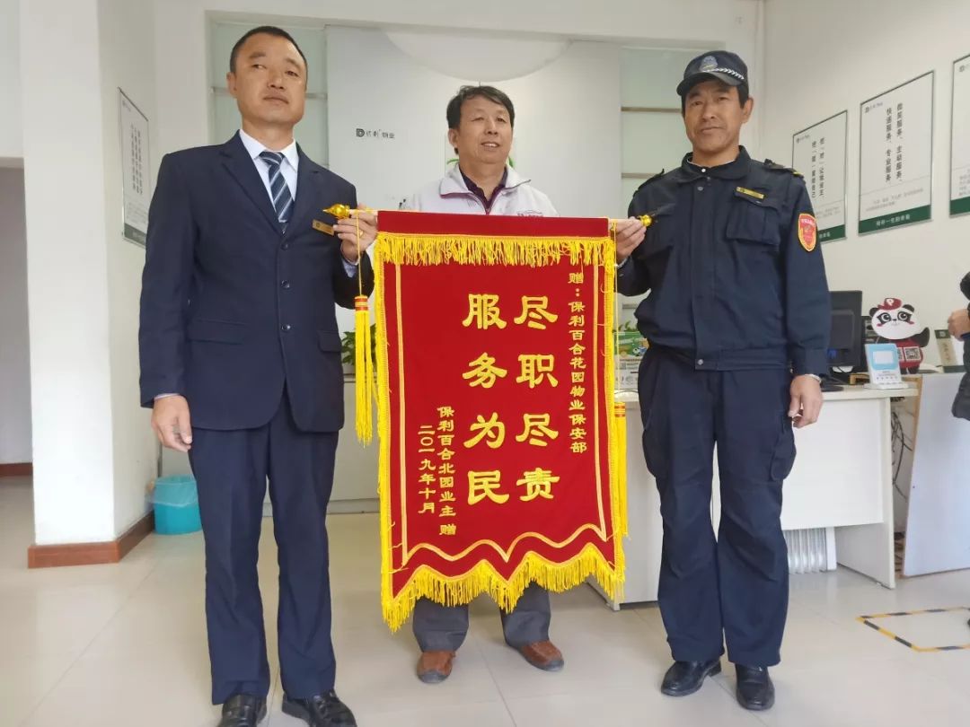 2019年10月14日,东园一位业主,年纪很大,并且腿脚不便,手里还拎着许多刚买的菜,正在园区巡查的曹班长看到后,主动上前帮忙,并送业主回家,受到业主的好评。业主声称曹班长已经不止一次的帮助自己、送自己回家了,因自己的儿女都在外地工作,只能自己每天出去买菜,因年纪大,腿脚不是很方便,每次看到曹班长他都会主动帮助送自己回家。为表示对曹班长的感谢,业主特意做了一枚锦旗“尽职尽责、服务为民”送到物业,感谢保利物业百合物业安防部。