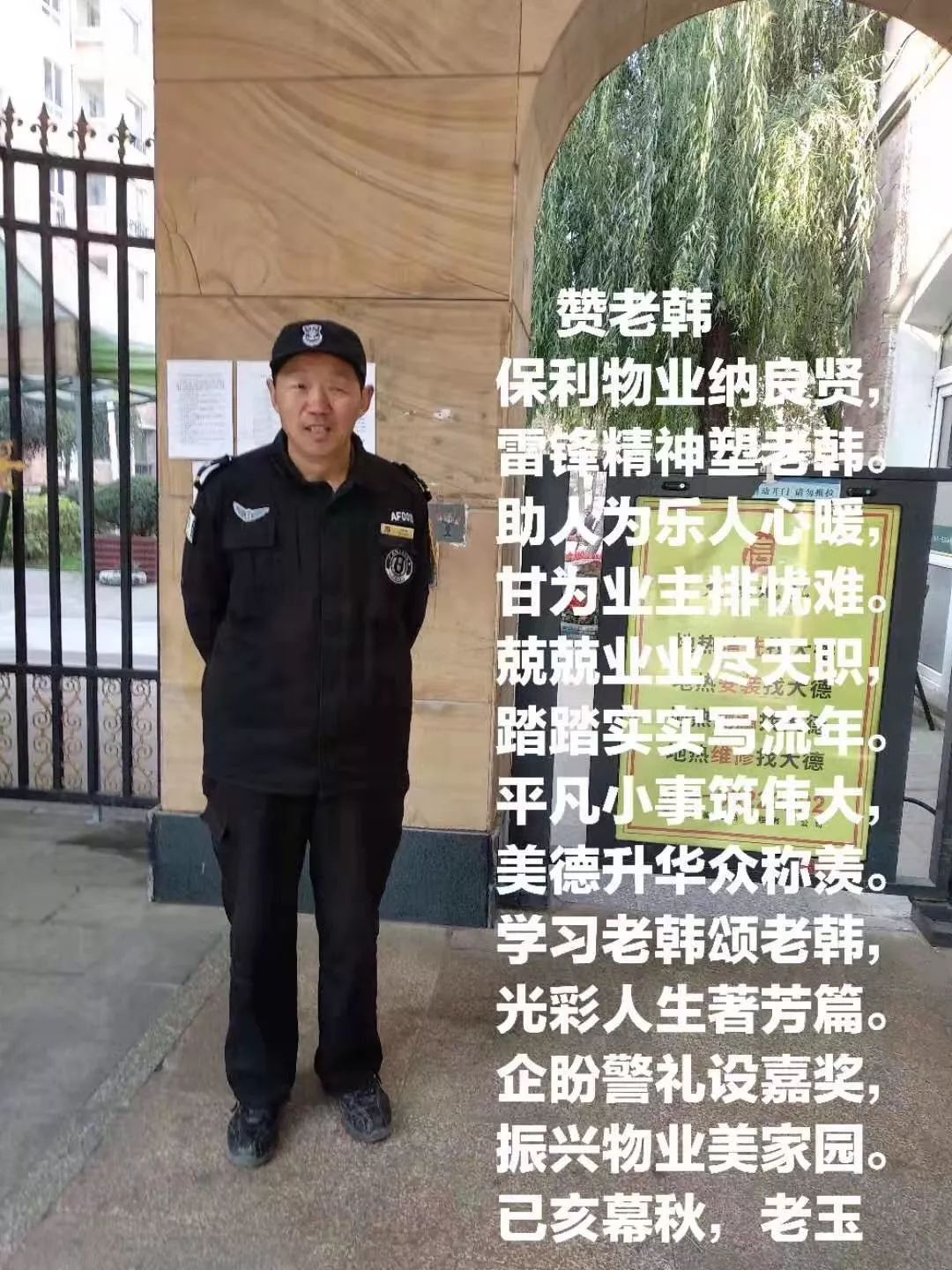 韩双立,男,汉族,2011年11月5日加入辽宁保利物业管理有限公司,现任保利花园一二期安防部安防员。提到老韩,保利花园一二期的业主们无不竖起大拇指,因为这个默默无闻、忘我工作的安防员每天都在用实际行动守护着和院的幸福。