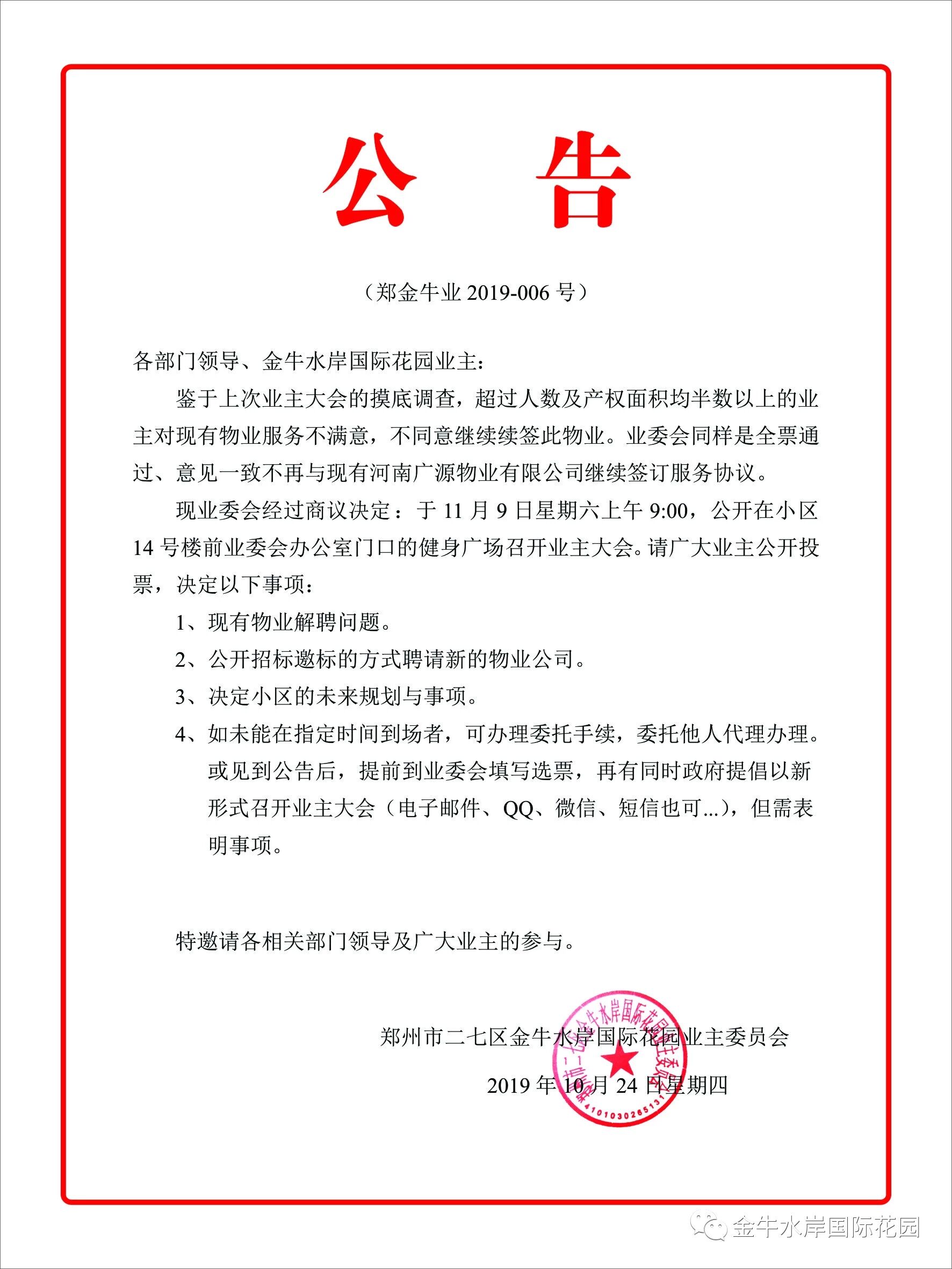 if (!window.__second_open__) { document.getElementById('js_image_desc').innerHTML = " 金牛?水岸国际花园业主委员会,定于2019年11月9日上午9点召开业主大会,在14号楼前小广场,通过前期考察、对比,现选出三家物业公司愿意在物业费不涨价的前提下,来我小区提供物业服务,并对小区现有问题进行整改,届时请业主光临现场,投出神圣的一票。".replace(/\r/g,"").replace(/\n/g,"