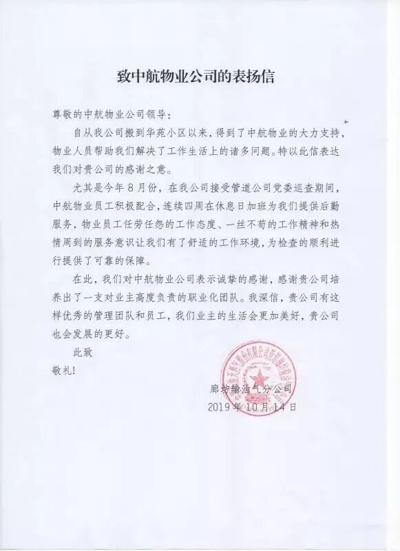 中航物业|任劳任怨 一丝不苟——廊坊输油气项目获业主感谢信