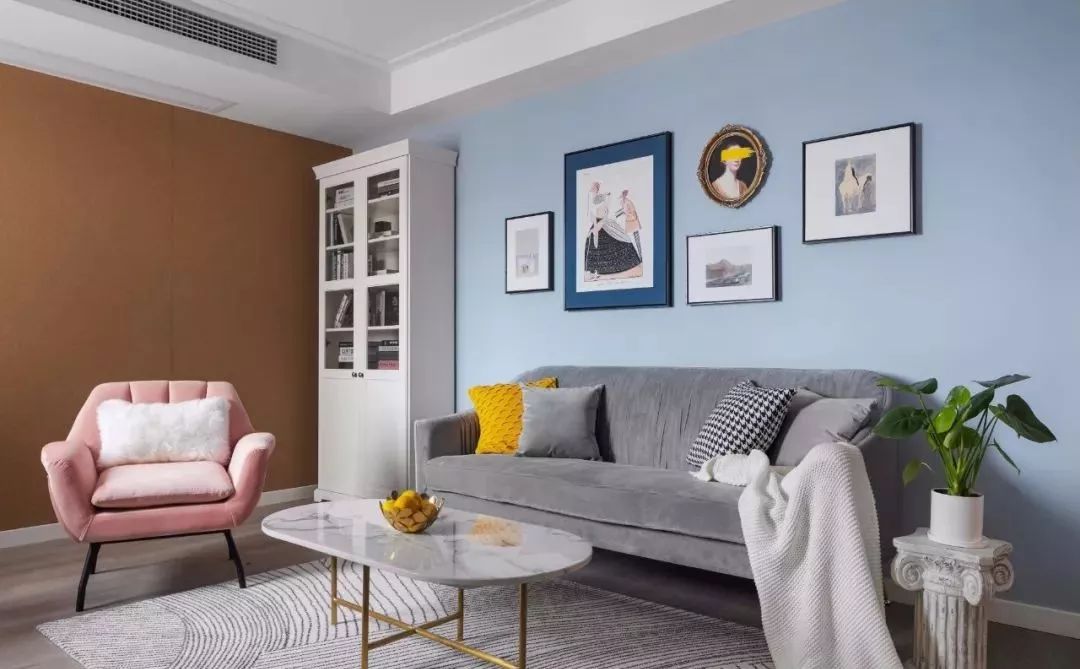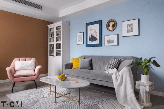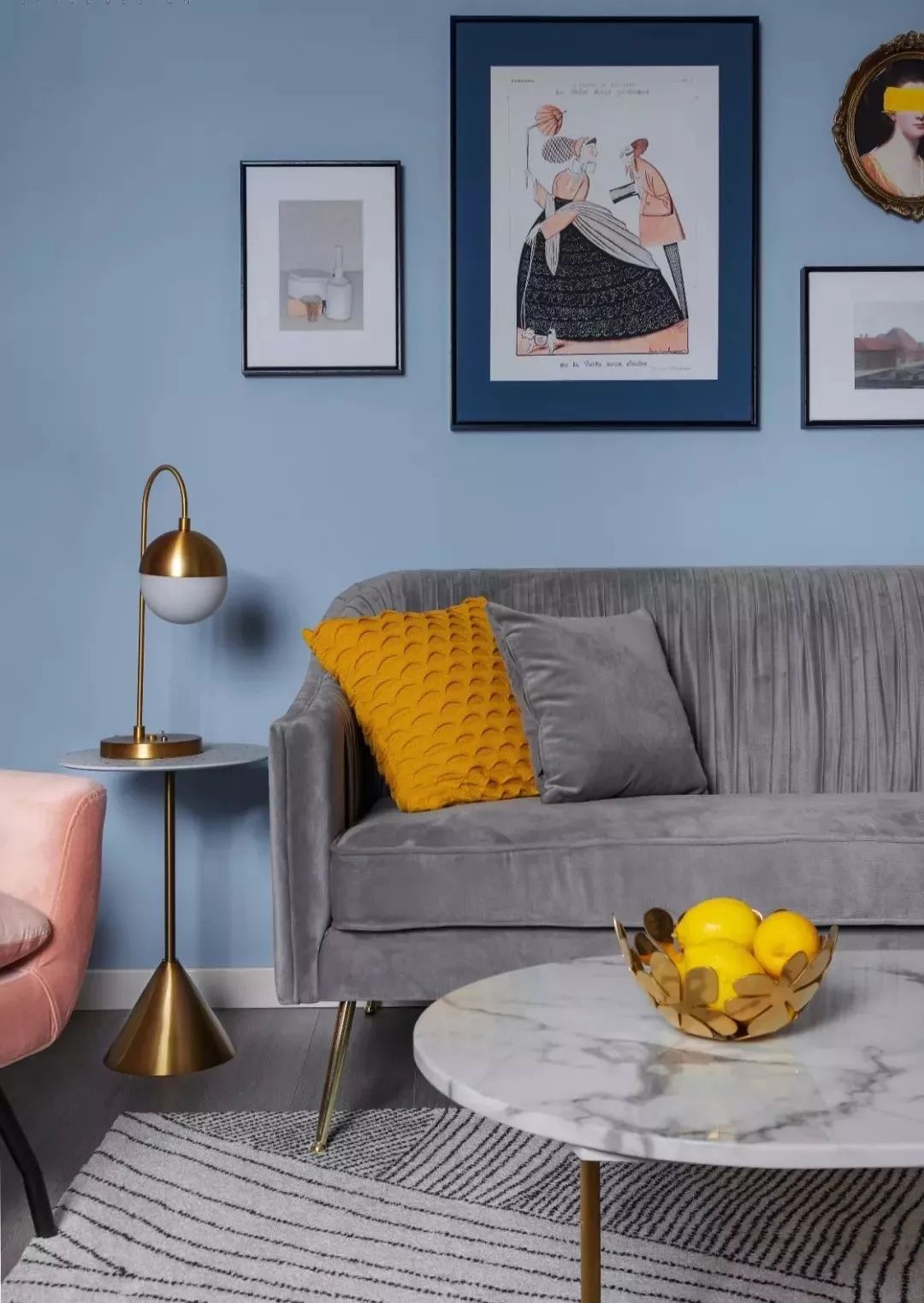 丝绒沙发十分有质感,为空间带来一丝柔软和温暖。因为屋主不喜欢大白墙,所以墙面选择了天蓝色,再加上小面积的色彩做点缀,主次分明,温馨又有层次感。