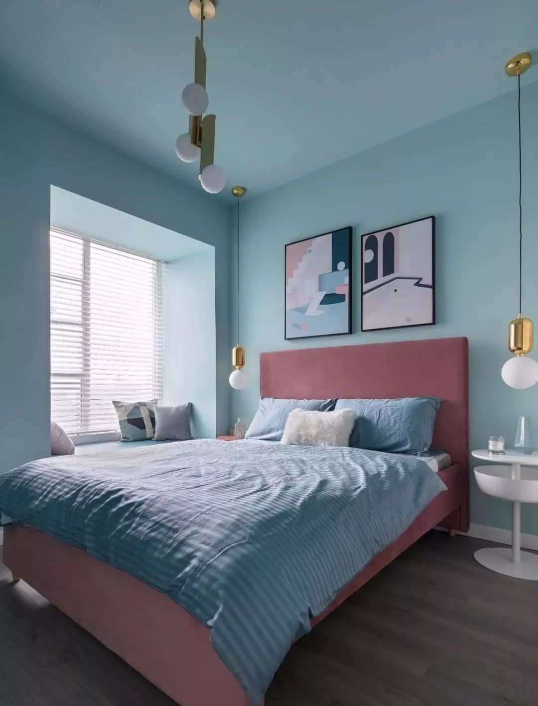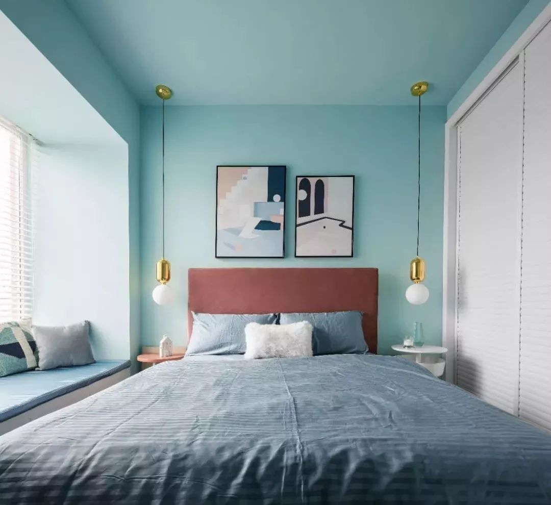 两边造型不同的床头柜增加趣味性,一个与床的颜色呼应,一个与柜体颜色相搭,也能增加空间色调的连贯性。