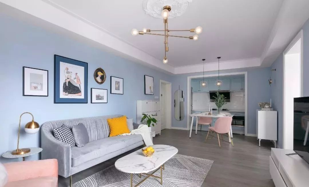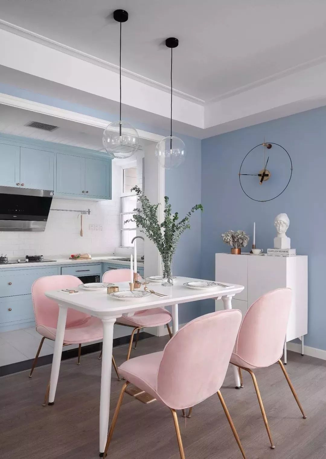 清新淡雅的天蓝色从客厅一直延伸到餐厅和厨房空间,保持了整个空间腔调的一致性。白色的餐桌搭配粉色+金色的餐椅,简洁柔美且有质感。