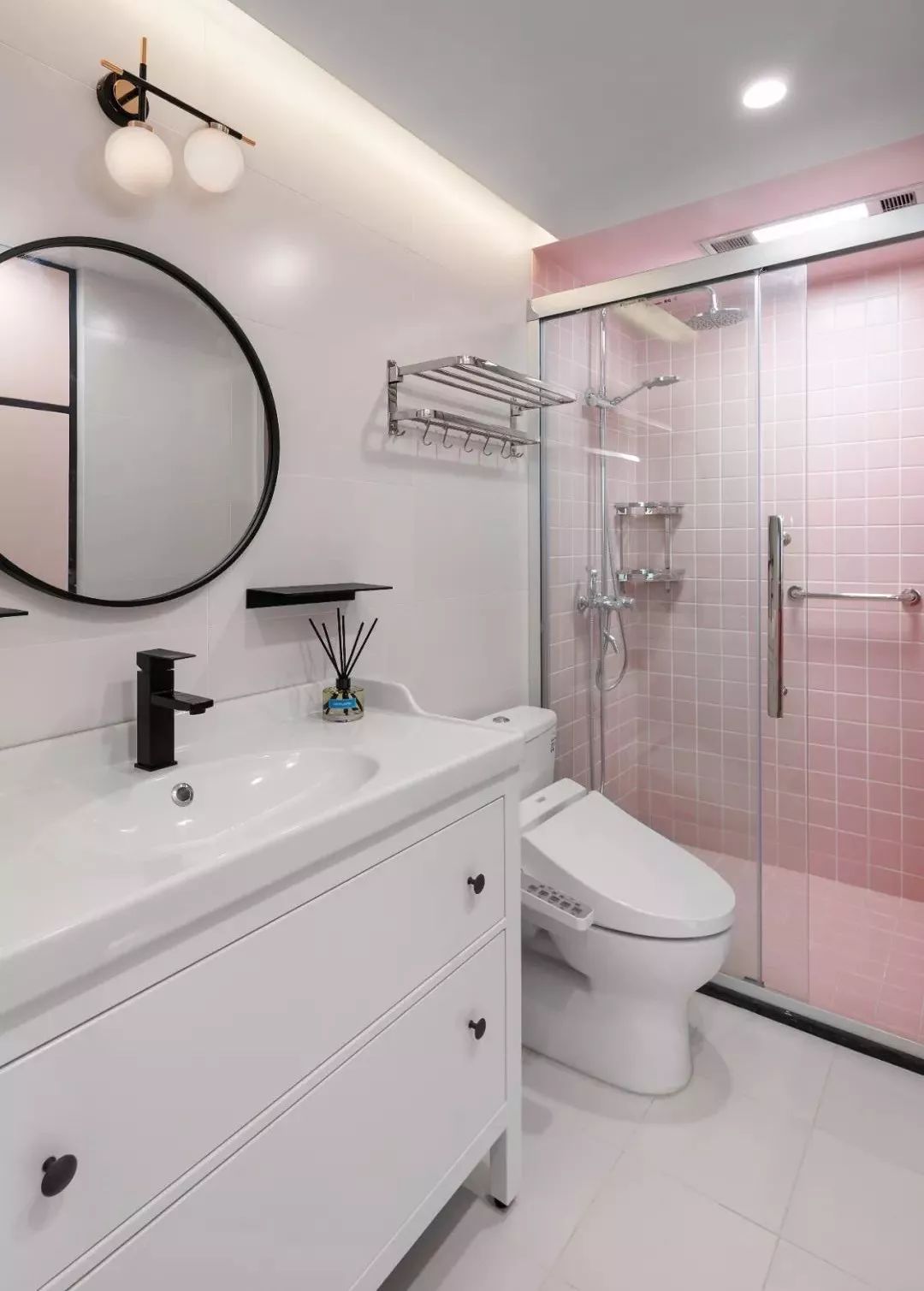 卫生间则做了干湿分区,不同色彩的瓷砖视觉上也分割了两个区域。超大浴室柜、墙上置物架、不锈钢挂钩...多方面保证储物空间,让屋主的生活更便利。
