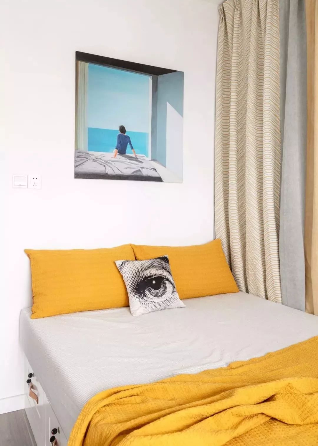 次卧采用榻榻米设计,平时储物,也方便父母偶尔过来小住。次卧的色彩较为简洁,以黄色床品做色彩的提亮。装修画在视觉上减轻了空间的逼仄感。