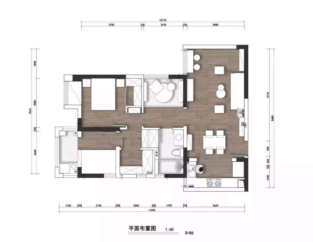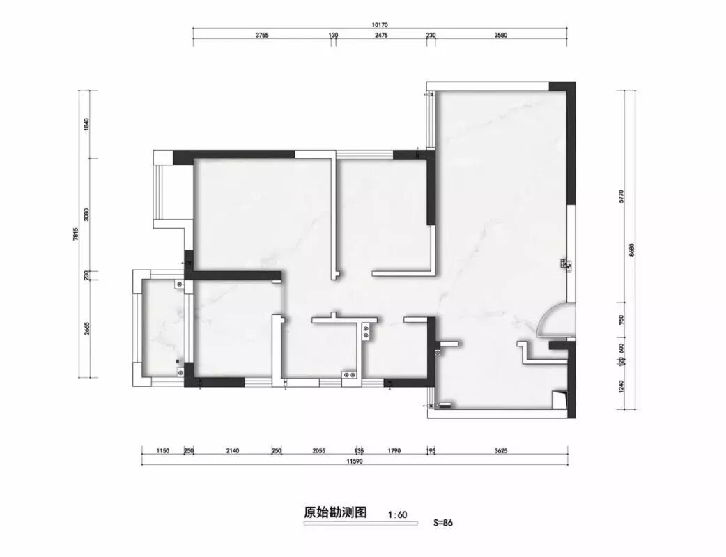 1、改变了原始动线,将原走廊平行右移,使餐厅墙面变大,客餐厅比例更协调。