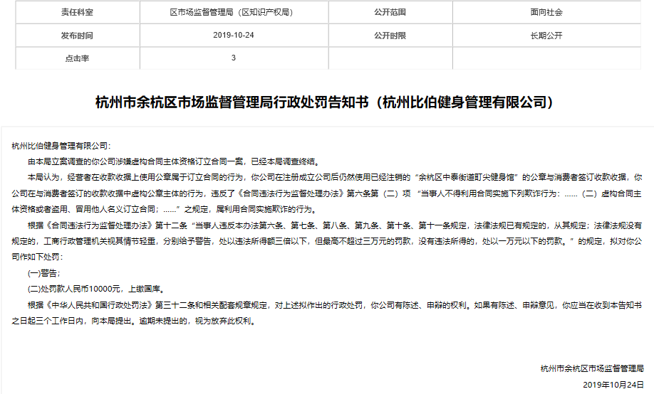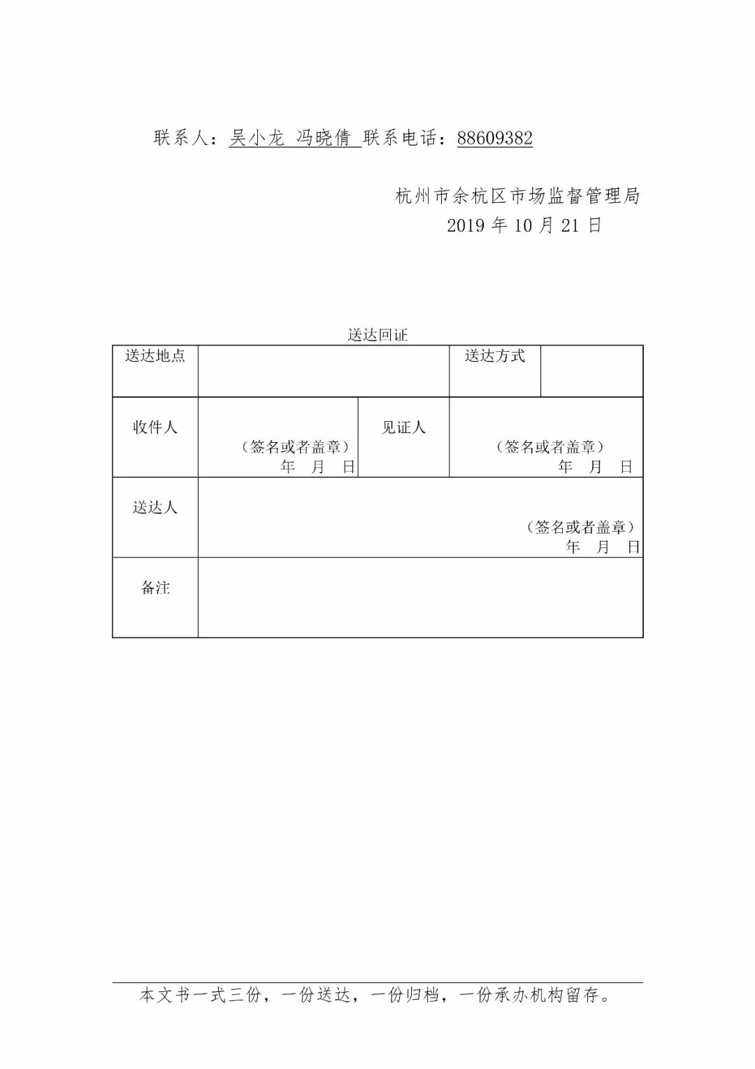日前,余杭区市场监督管理局就进一步的调查结果及处罚告之书如下: