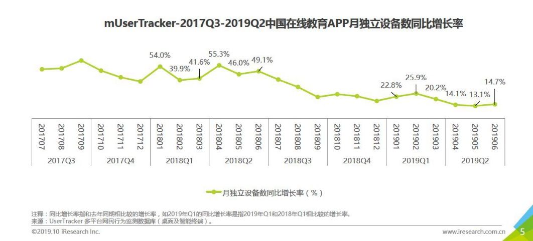 艾瑞咨询数据显示,虽然在线教育整体流量池仍在持续扩大,但相比于前两年的高速增长,其增速明显放缓。2018年上半年,中国在线教育APP月独立设备数的同比增长率维持在40%-54%的水平,到了 2019年上半年 ,这一数据已经降至14%-26% ,平均每月仅为18.5%。