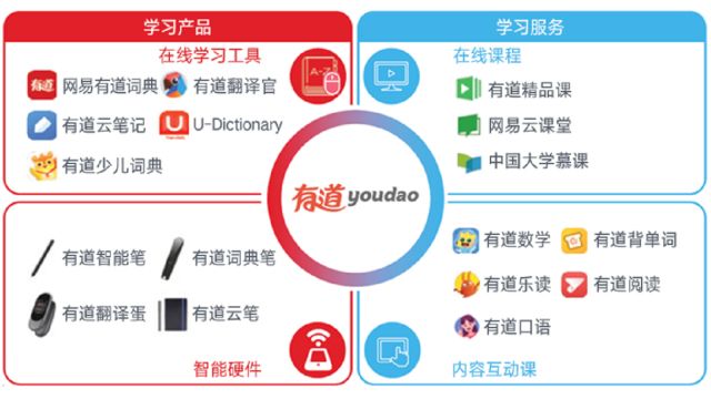 网易有道的核心业务主要由四部分构成:一是在线学习工具,包括有道词典、有道翻译、有道云笔记等;