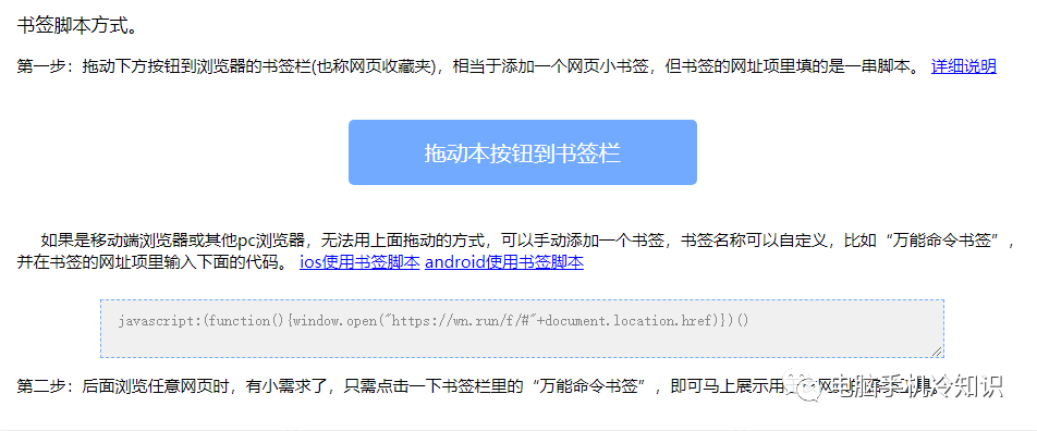 该网站上有详细的教程,将命令放入浏览器书签(收藏夹),访问网页时,点击这个书签,就会直达网页的功能命令页【推荐,点鼠标就搞定很方便】(获取该网站网址请关注“电脑手机冷知识,回复关键词1025即可获取)