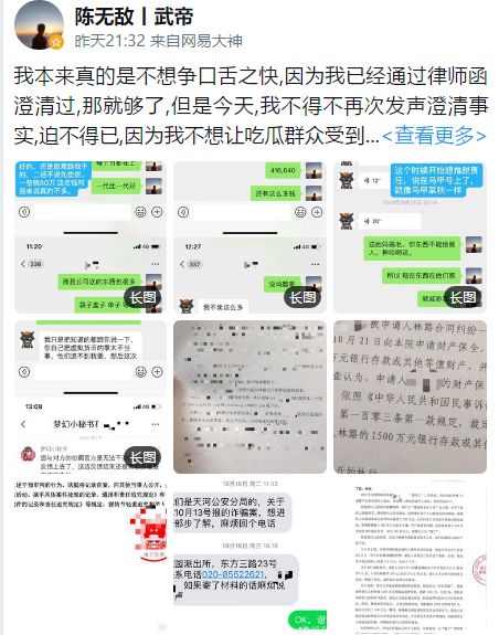 陈无敌的事件可以说是10月份,梦幻西游中发生的最大事件了。因为它牵扯的面很广,就连老王都被迫出来发声了。而一些神豪,比如珍宝阁的涛哥和醉奶先生,他们也都为这件事表态了自己的态度。这本来是几个人之间的纠纷,他们私下解决肯定是最好的。但是因为晚秋的爆料,一下子就把问题给扩大化了。本来这几天稍微平静了一点,就在昨天的深夜,当事人陈武帝居然再次发长文。他在开头写道:“我本真的不想争口舌之快,因为我已经通过律师函澄清了。”可见这次的发言是他压抑了很久之后,忍不住再次发声。