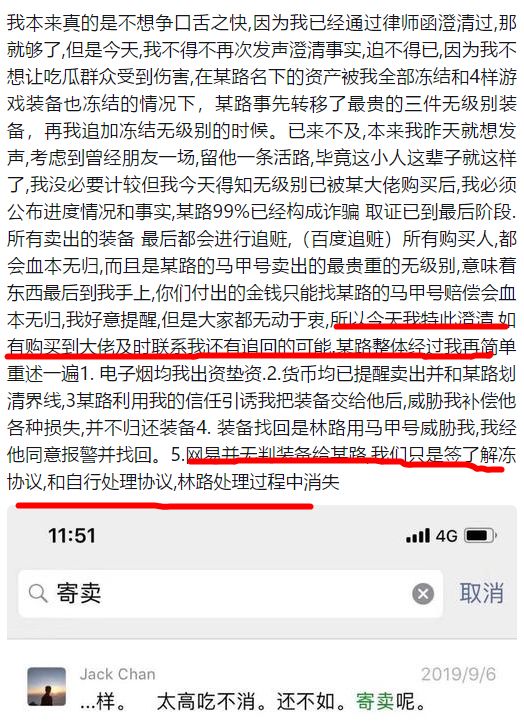 这次的阐述有几个特点,一个就是表达了自己的主张。他先声明,这件事还在处理之中,可是有争议的无级别装备,目前已经被某大佬买走了。这件事存在风险,因为他会走追回的手段,那么大佬的权益可能无法保证。他还特意写道:“我今天特此澄清,如果有购买到我装备的大佬,即使联系我,还有追回的可能。”然后针对事情的焦点,电子烟、电子货币等他都做出了自己的阐述。