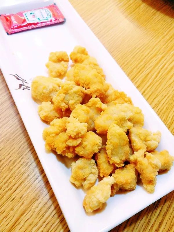 金黄鳞片外观和酥脆的口感,肉和炸粉的黏结刚刚好,在油锅里翻滚几下,经过热油的洗礼,变得又香又酥。蘸上一点番茄酱,味道更佳!