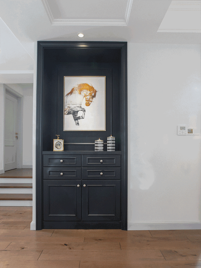 ● 玄关 / 入口大厅采用顶级鞋柜设计,对面楼梯旁的深蓝色门廊柜成为整个空间的点睛之笔!