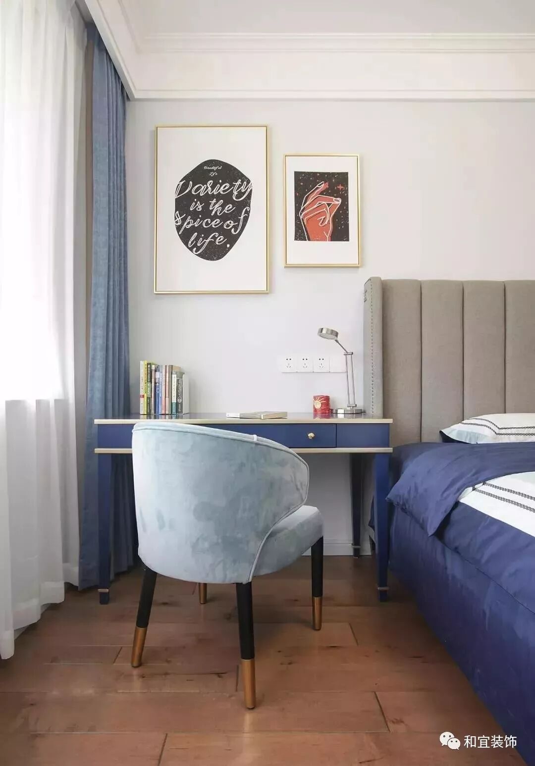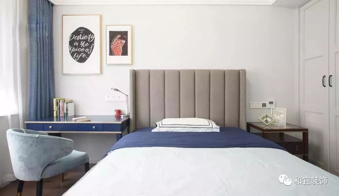 ●次卧 /蓝色卧室装饰配以浅灰色高背软垫床,营造简约温馨的空间;