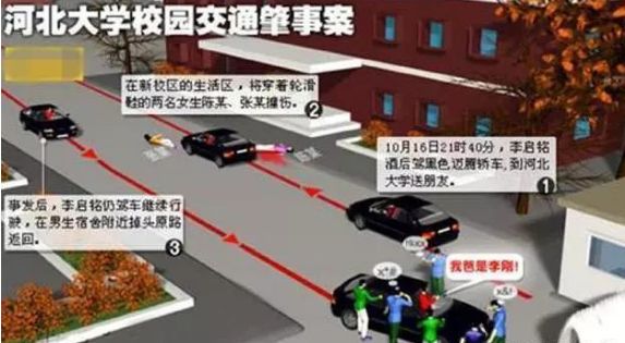2010年10月16日晚上,李启明在学校里醉酒驾驶一辆黑色大众梅腾轿车,因为她打了两个女孩,其中一个是直接从她的身上撞出来的。然而李启明并没有停下来,继续开车送她们回宿舍。然而,他最终被保安和学校门口的同学拦住了。然而,他并不后悔,而是厚颜无耻地喊道:如果你有能力起诉我,我的父亲就是!