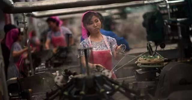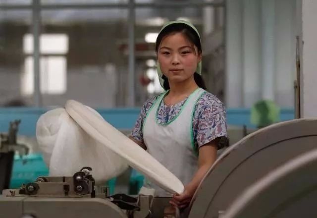 纺织女工在平壤的纱线厂工作。她来自农村,已经2年多没有回家了。孩子今年3岁半。