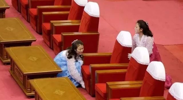 两名美女招待员在调整领导人座椅。一会儿将会有庆祝朝鲜战争胜利的歌舞表演。