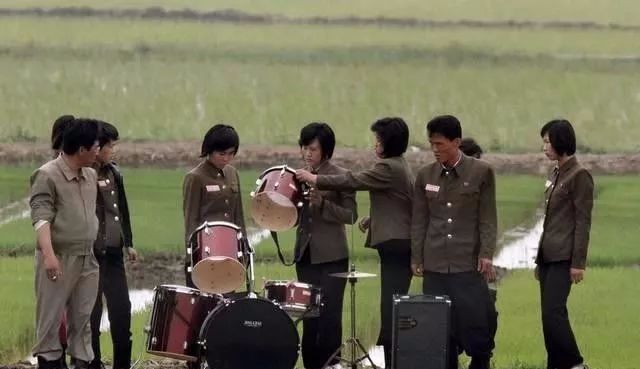 女鼓手们在朝鲜与中国边境检查架子鼓。一会儿要在田地里向当地农民们做慰问演出。