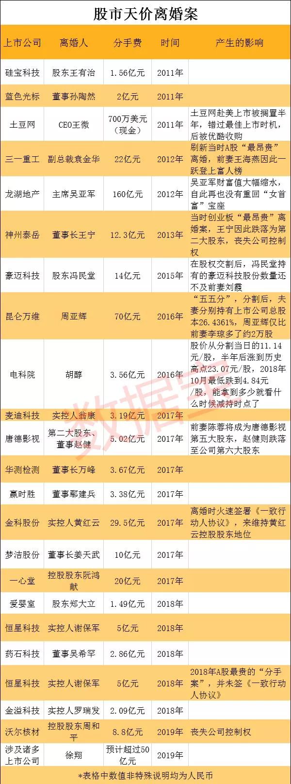 从龙湖地产吴亚军的160亿“分手费”,到我大A股昆仑万维创始人周亚辉夫妇的70亿离婚案,无不被股民们所热议。