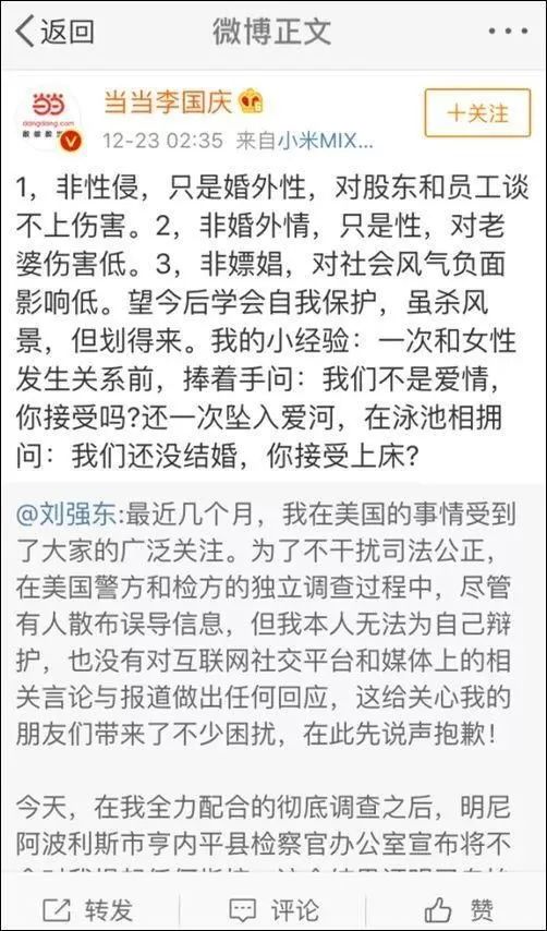 2018年12月23日,李国庆转发刘强东的致歉,并说了三点: