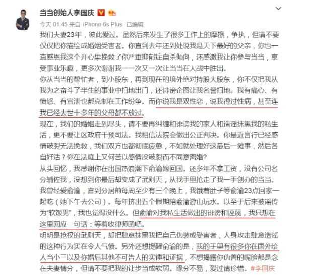 看到俞渝曝出如此多黑料,李国庆在10月24日凌晨也发文反击,他先是否认了同性恋和得性病,称这是俞渝对他的诽谤和诬蔑,他说自己手上有大量俞渝在国外给人当小三的实锤和证据,不想揭露出来完全是念在夫妻情分,不要把他的让步当成软弱。