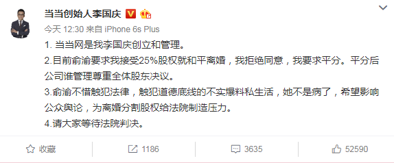 如果此次李国庆和俞瑜离婚,按照李国庆最新的说法,控制权一分为二,那当当无疑将进一步陷入混乱中,同时,也会产生国内另一桩“天价”离婚案。