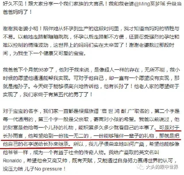 直到10月24日下午,何猷君宣布妻子产子,这个孩子受到了何家的热烈欢迎,何猷君为孩子取名为Ronaldo,而中文名则是赌王亲自取的,叫做何广燊。