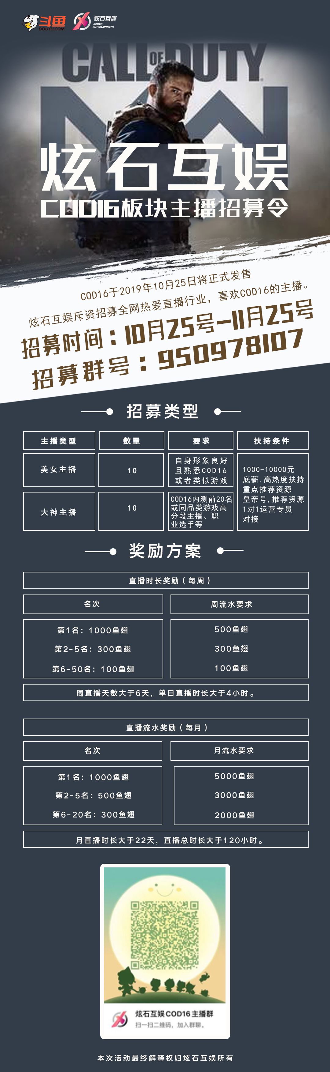 COD16于2019年10月25日正式发售,炫石互娱斥资招募全网热爱直播行业,喜欢COD16的主播。