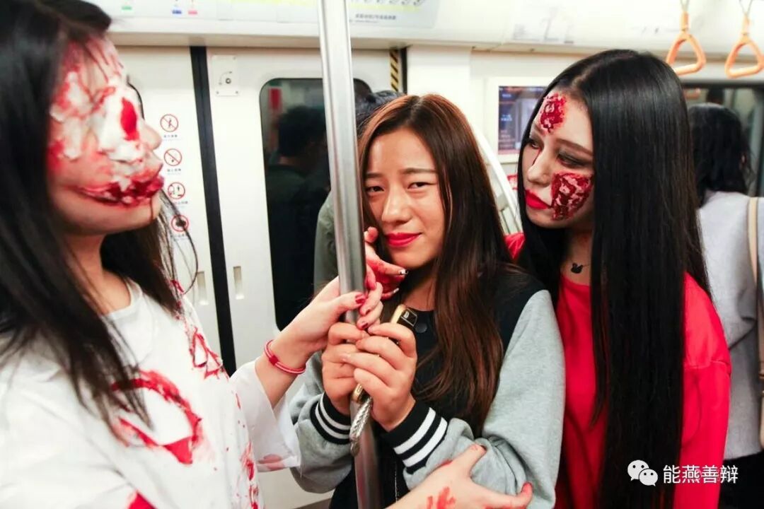 好好的脸蛋儿,为什么要画上“带血”的妆呢?原来啊,是因为万圣节快要到了,这些乘客化妆乘坐地铁,是要去参加广州某度假区举办的万圣节活动。