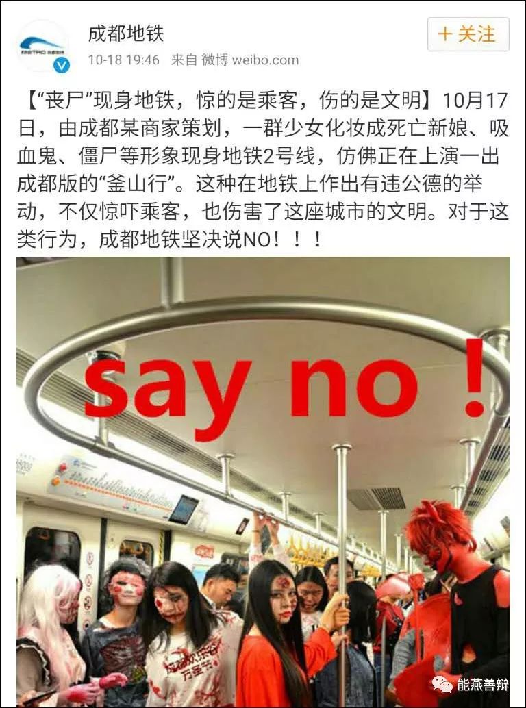 在地铁里,如果有人被这些装扮给吓着了,甚至引发了集体恐慌,造成安全事件,这个责任又该谁来扛呢?这样的事情不是没有发生过,2014年9月,武汉一家造型学校的30多名学生为了展示他们的创意化妆,打扮成僵尸涌进地铁车厢,乘客们被吓得惊慌逃窜。