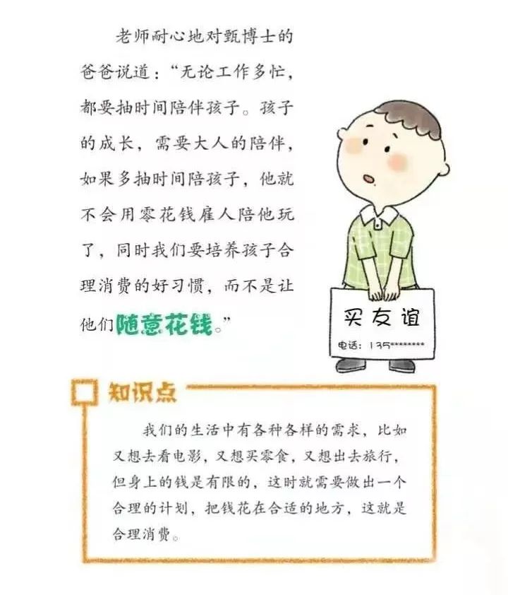 最后,甄博士的爸爸也明白了,除了要培养孩子良好的消费习惯外,陪伴对孩子的成长也是很重要的。于是,甄博士的爸爸决定每天抽空一小时陪伴甄博士,甄博士开心得不得了。