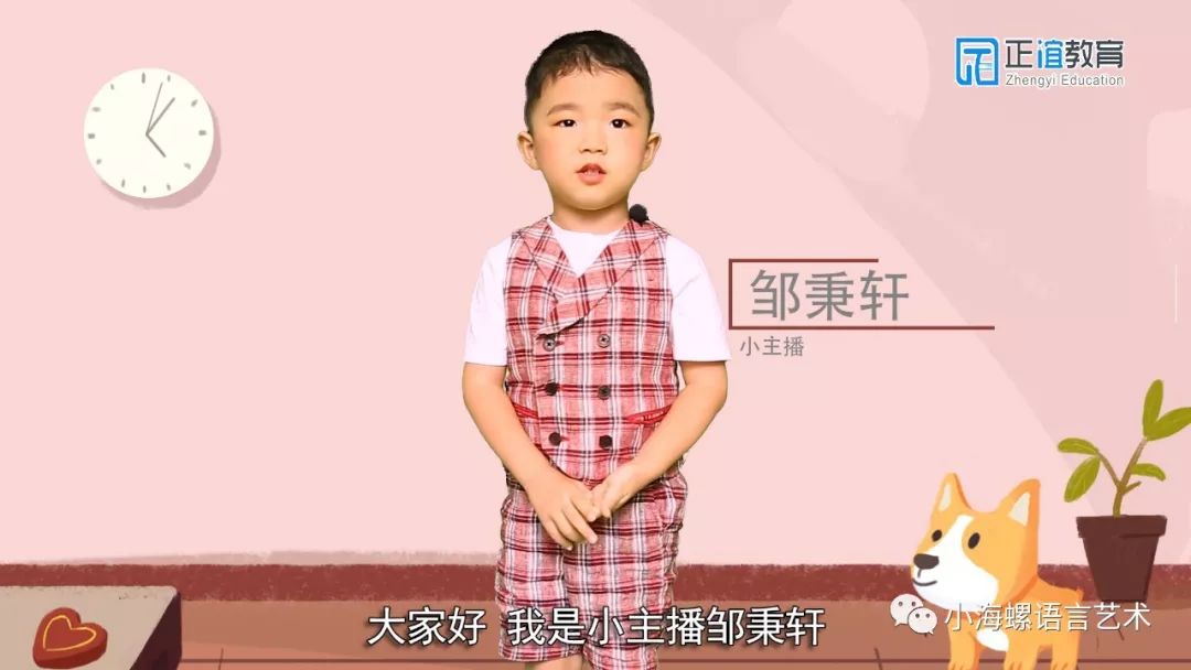 小主播:邹秉轩 镜头感十足,表达流利 小主播邹秉轩最喜欢的动物是狗狗是我们人类的好朋友,而且它非常聪明如果家里有陌生人来了,它就会叫个不停是看家的好伙伴哦