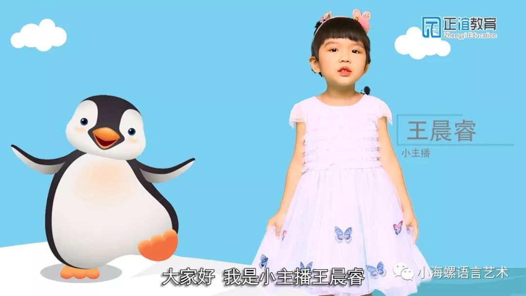 小主播:王晨睿 表达流利,发音清晰 小主播王晨睿最喜欢的动物是企鹅它们虽然不会飞但是游泳超级厉害的一小时可以游三十六公里呢~