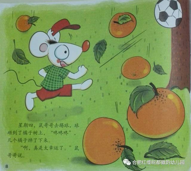 球砸到了橘子树上,“咚咚咚”,几个橘子掉了下来。“啊,真是太幸运了。”鼠哥哥说。