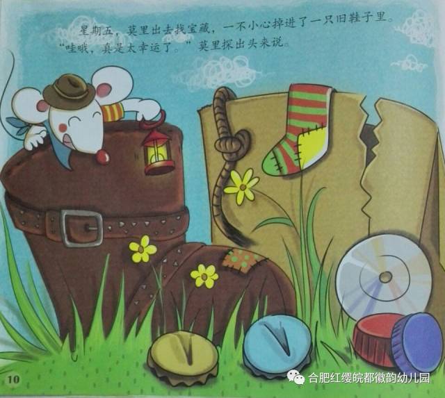 星期五,莫里出去找宝藏,一不小心掉进了一只旧鞋子里。“哇哦,真是太幸运了。”莫里探出头来说。