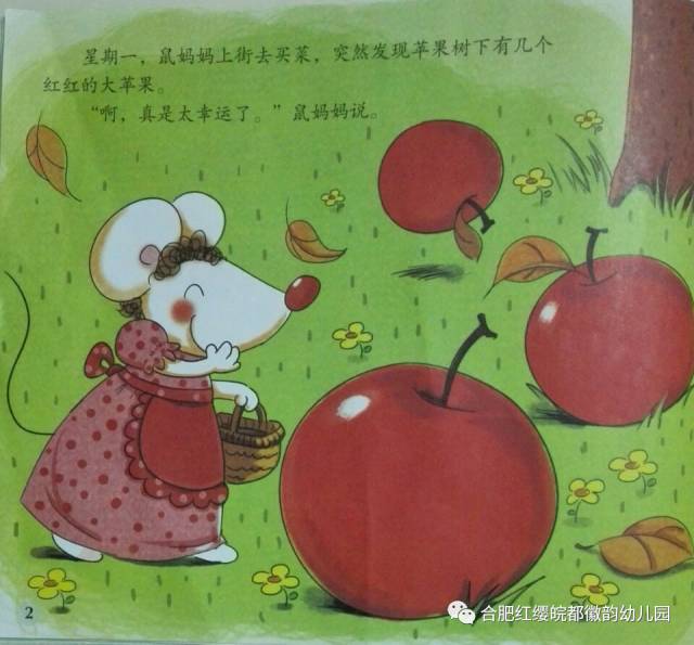 星期一,鼠妈妈上街去买菜,突然发现苹果树下有几个红红的大苹果。“啊,真是太幸运了。”鼠妈妈说。