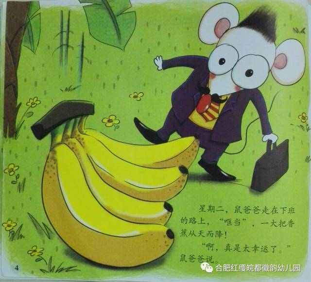 星期二,鼠爸爸走在下班的路上,“哐当”,一大把香蕉从天而降!“啊,真是太幸运了。”鼠爸爸说。